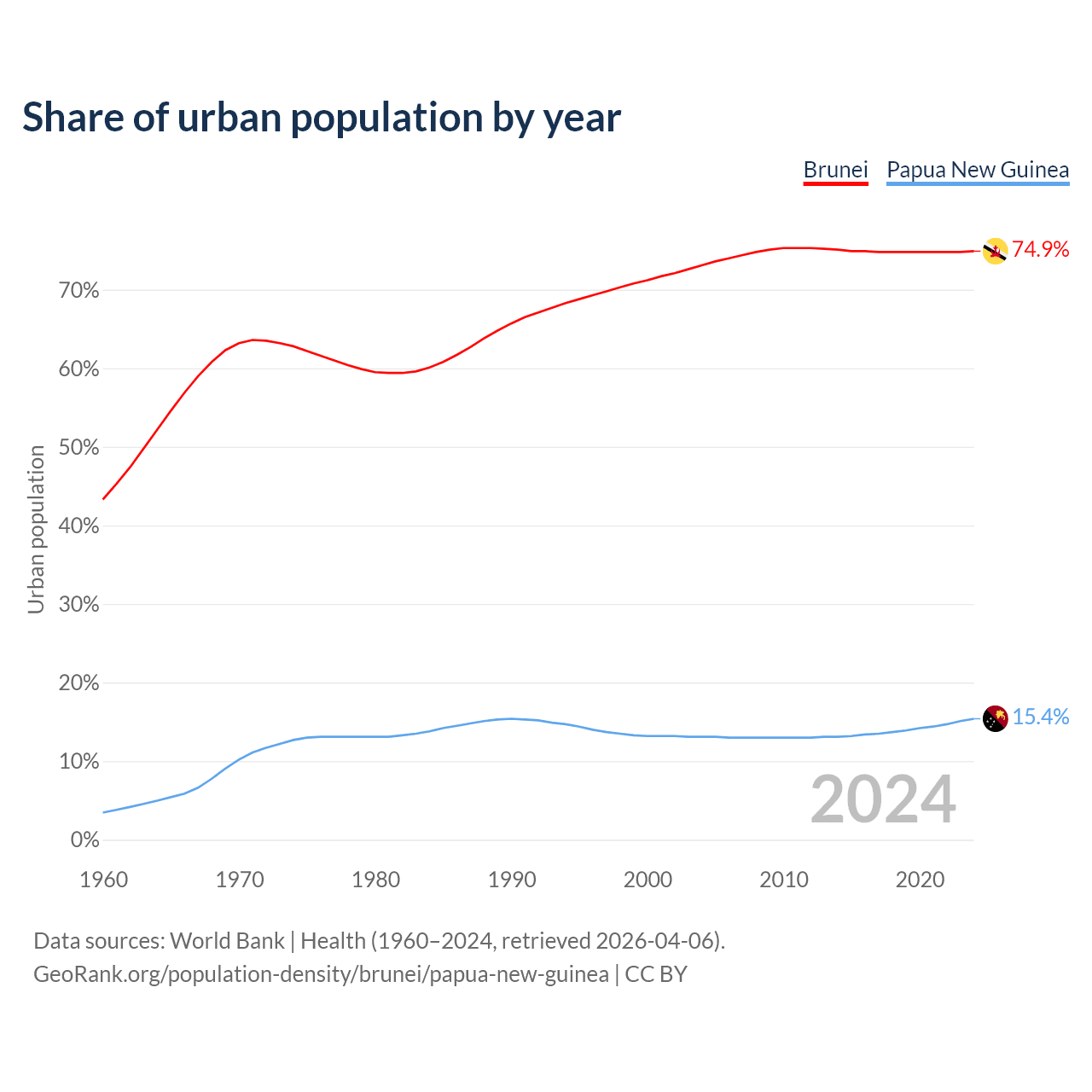 From 2004 to 2024, the share of urban population changed from 73.1% to 74.9% in Brunei and from 13.1% to 15.4% in Papua New Guinea.