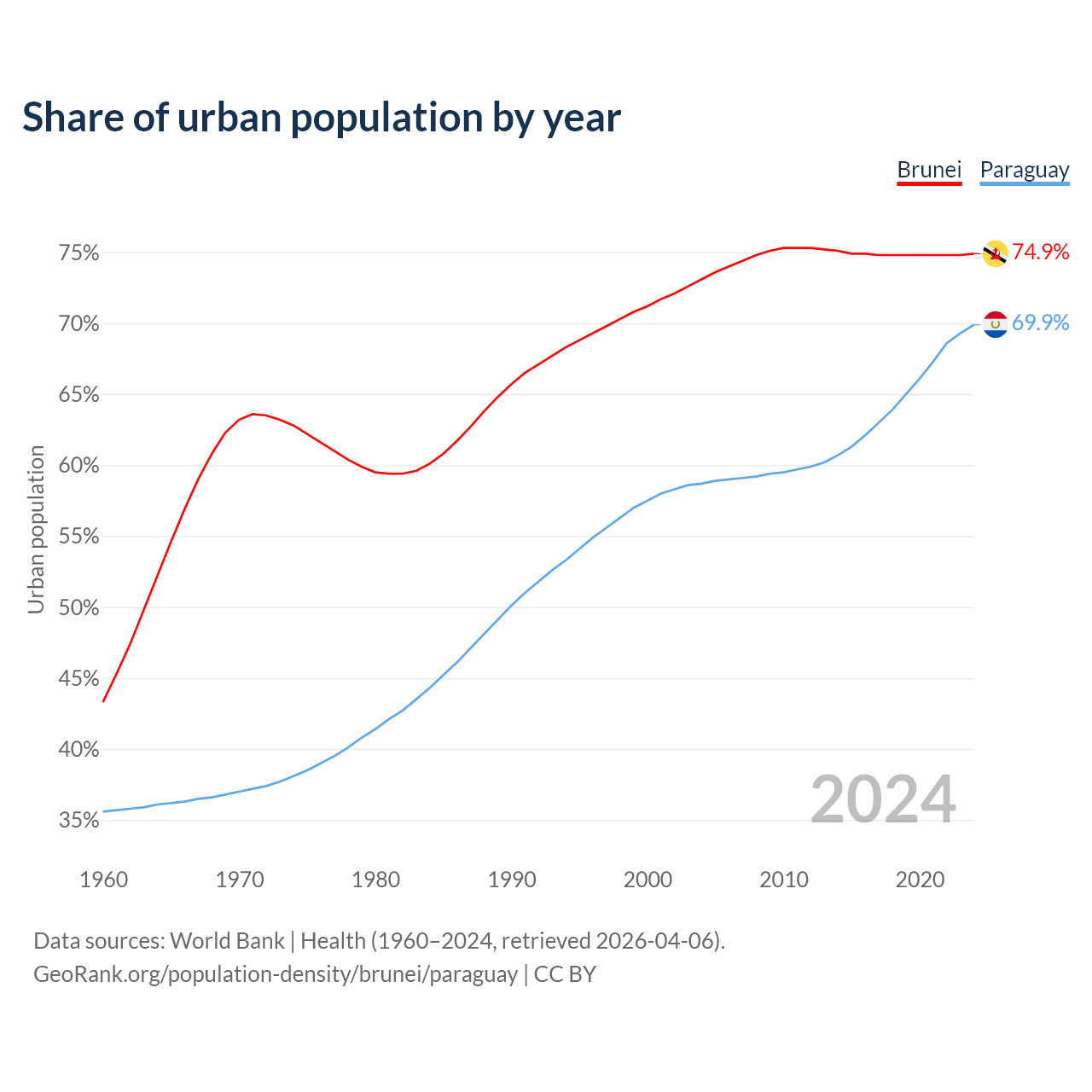 From 2004 to 2024, the share of urban population changed from 73.1% to 74.9% in Brunei and from 58.7% to 69.9% in Paraguay.