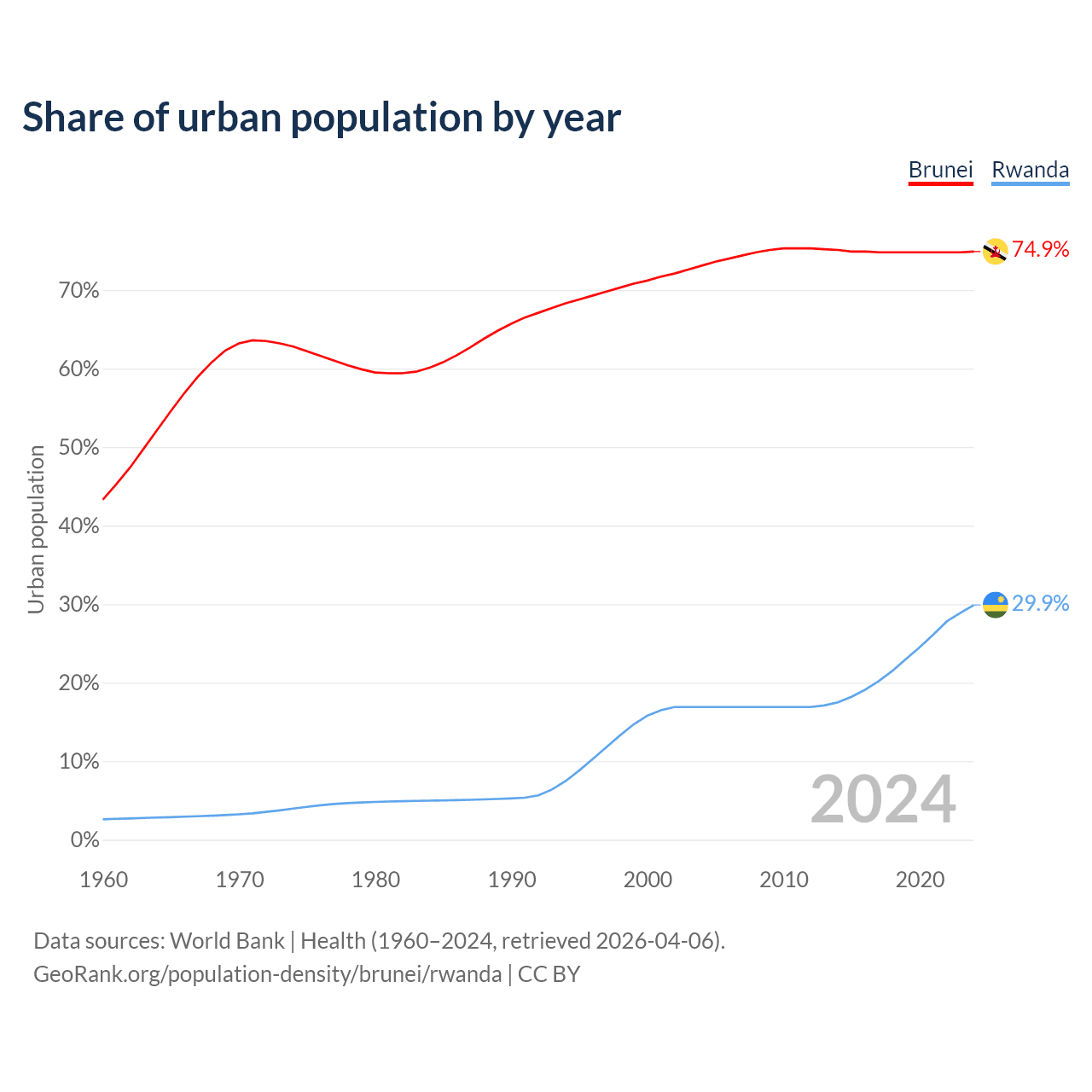 From 2004 to 2024, the share of urban population changed from 73.1% to 74.9% in Brunei and from 16.9% to 29.9% in Rwanda.
