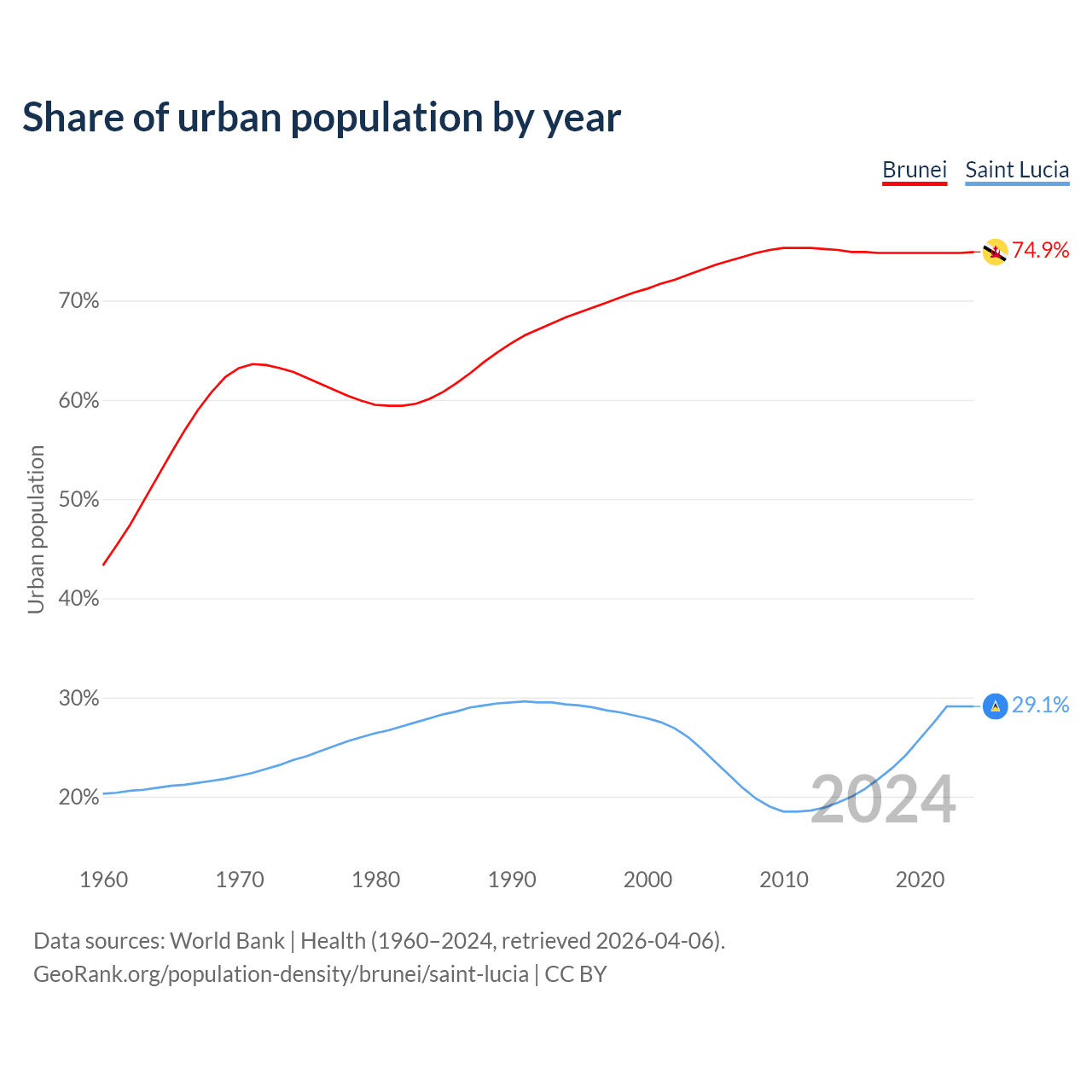 From 2004 to 2024, the share of urban population changed from 73.1% to 74.9% in Brunei and from 24.8% to 29.1% in Saint Lucia.