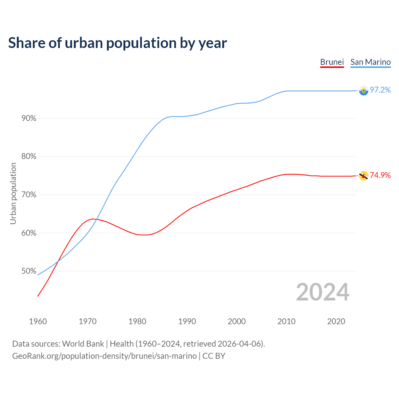 From 2004 to 2024, the share of urban population changed from 73.1% to 74.9% in Brunei and from 94.2% to 97.2% in San Marino.