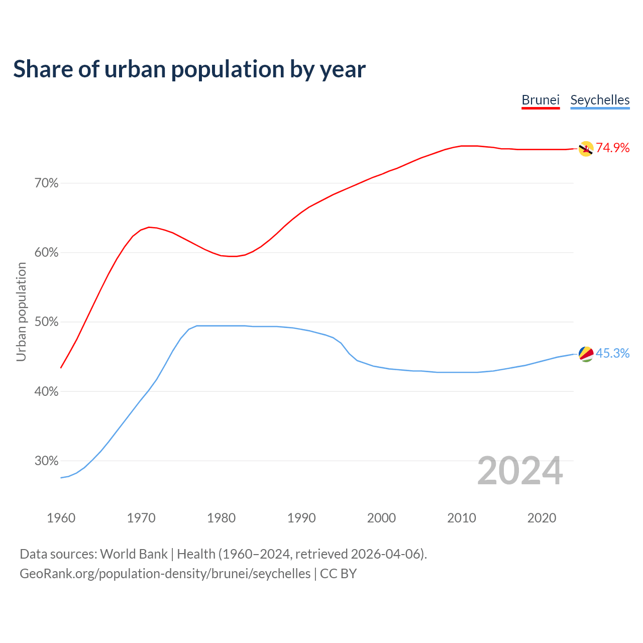 From 2004 to 2024, the share of urban population changed from 73.1% to 74.9% in Brunei and from 42.9% to 45.3% in the Seychelles.