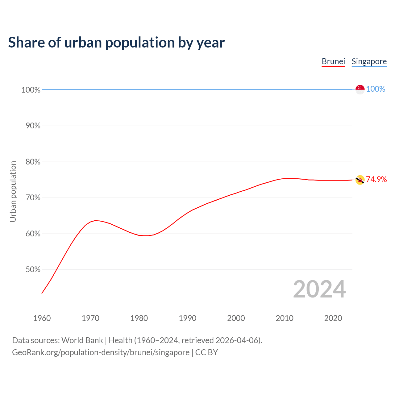 From 2004 to 2024, the share of urban population changed from 73.1% to 74.9% in Brunei and from 100% to 100% in Singapore.