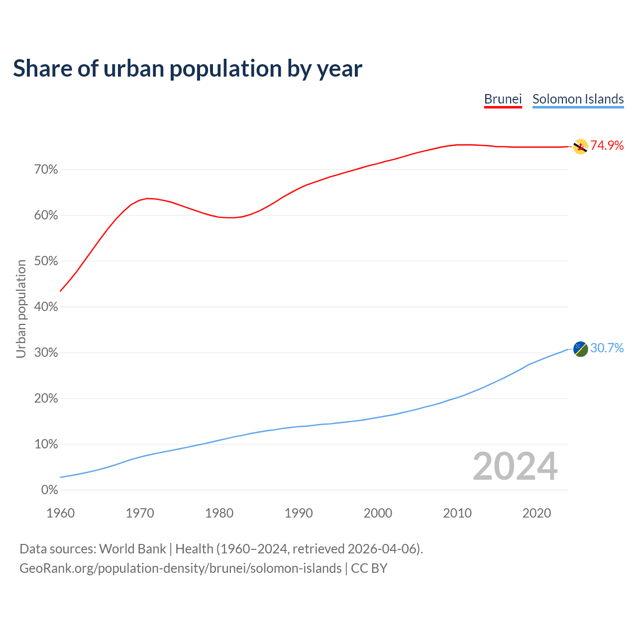 From 2004 to 2024, the share of urban population changed from 73.1% to 74.9% in Brunei and from 17.2% to 30.7% in the Solomon Islands.