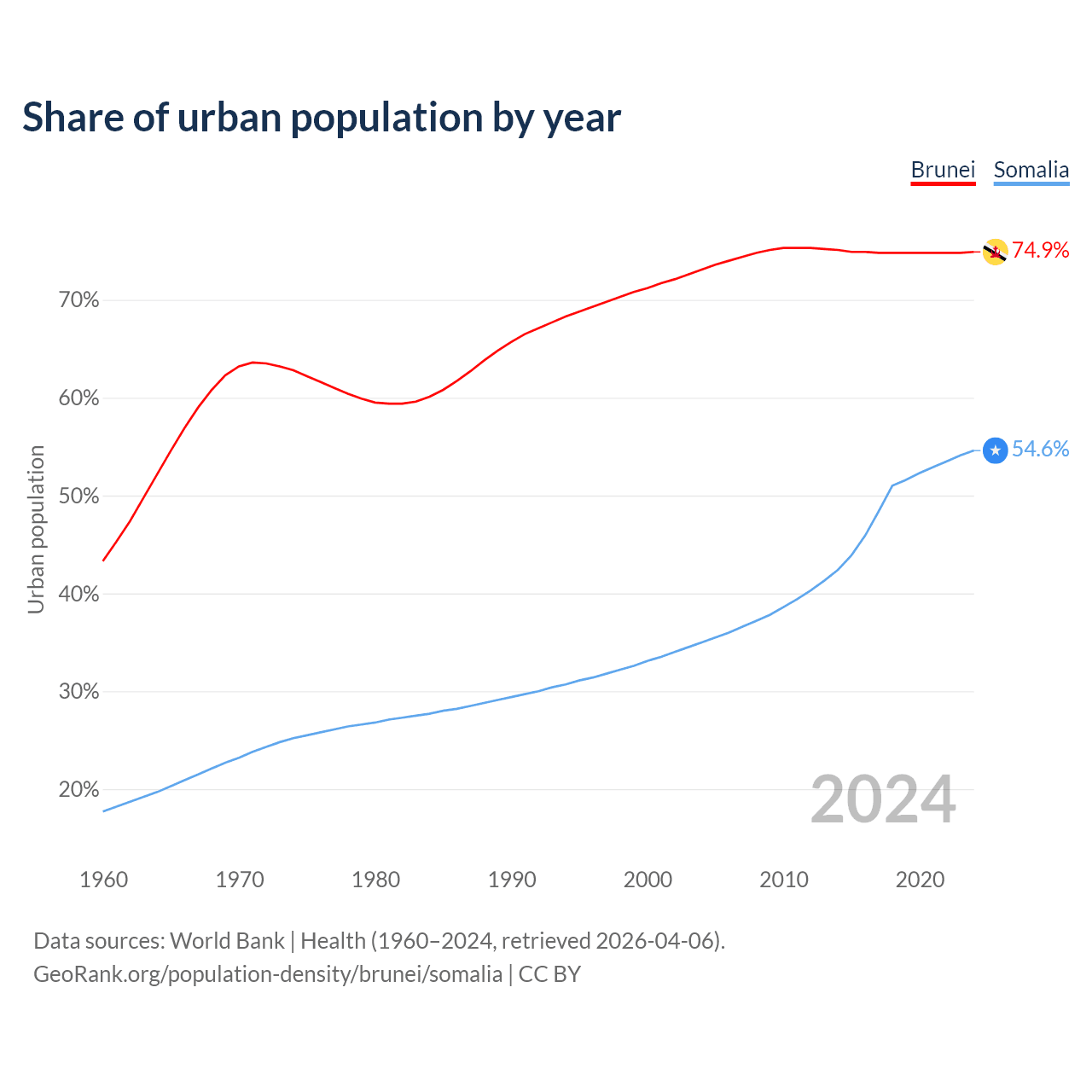 From 2004 to 2024, the share of urban population changed from 73.1% to 74.9% in Brunei and from 35% to 54.6% in Somalia.