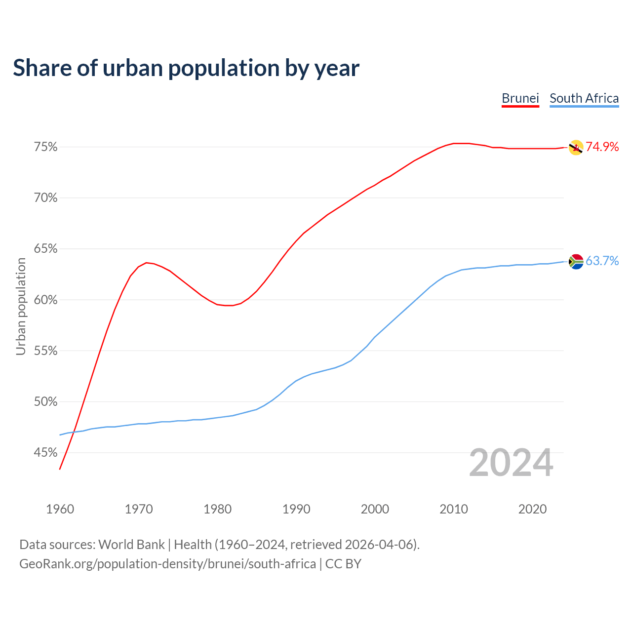 From 2004 to 2024, the share of urban population changed from 73.1% to 74.9% in Brunei and from 59.1% to 63.7% in South Africa.
