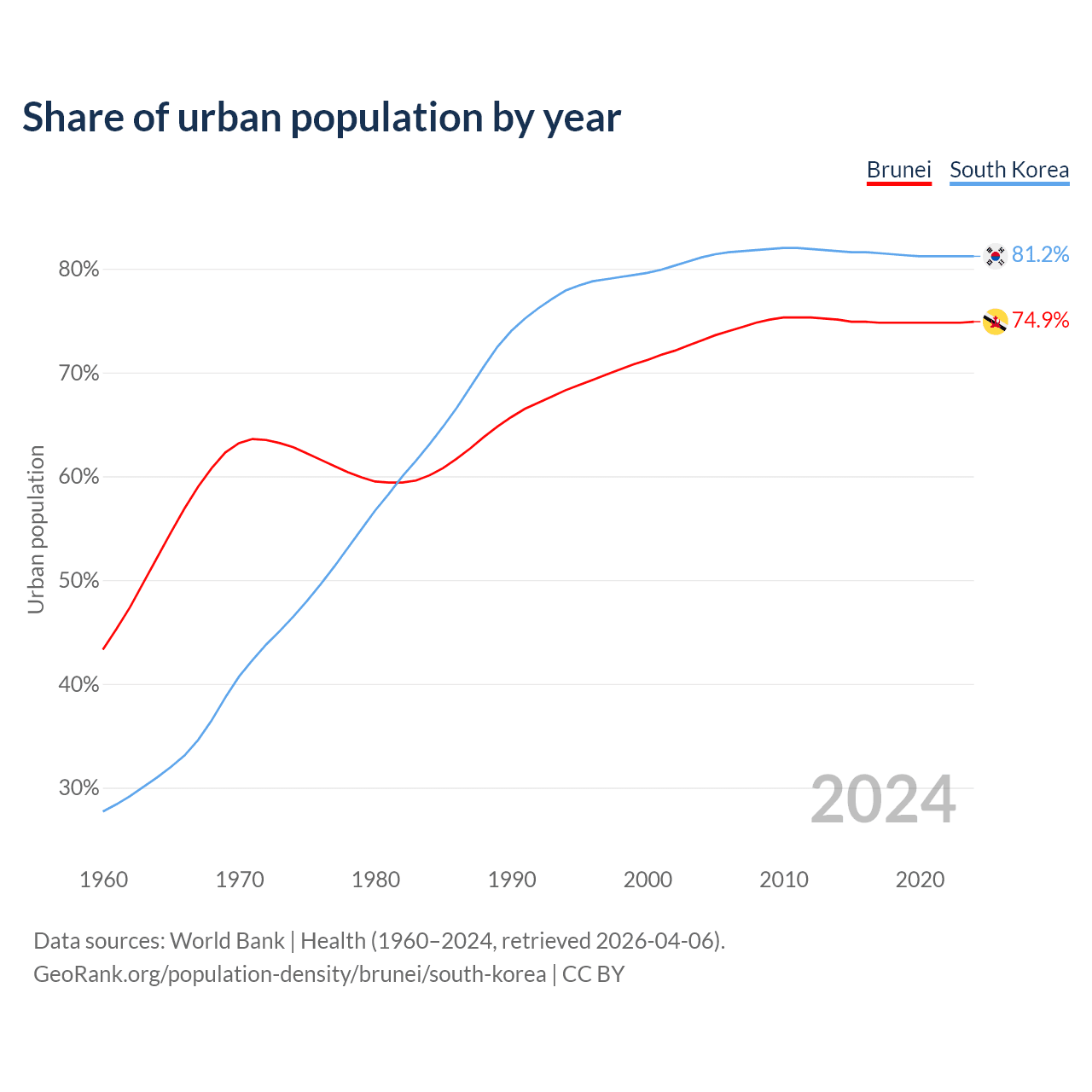 From 2004 to 2024, the share of urban population changed from 73.1% to 74.9% in Brunei and from 81.1% to 81.2% in South Korea.