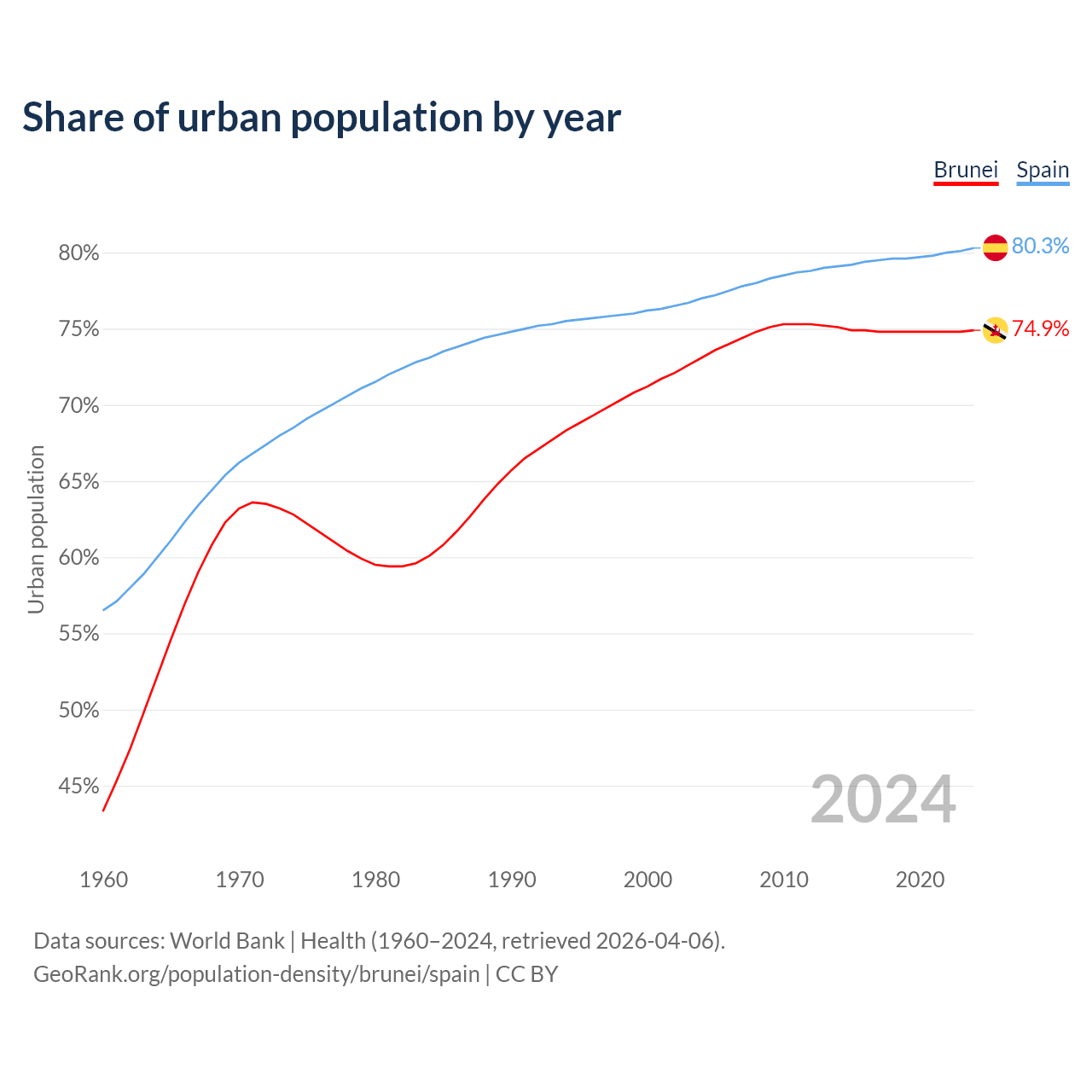 From 2004 to 2024, the share of urban population changed from 73.1% to 74.9% in Brunei and from 77% to 80.3% in Spain.