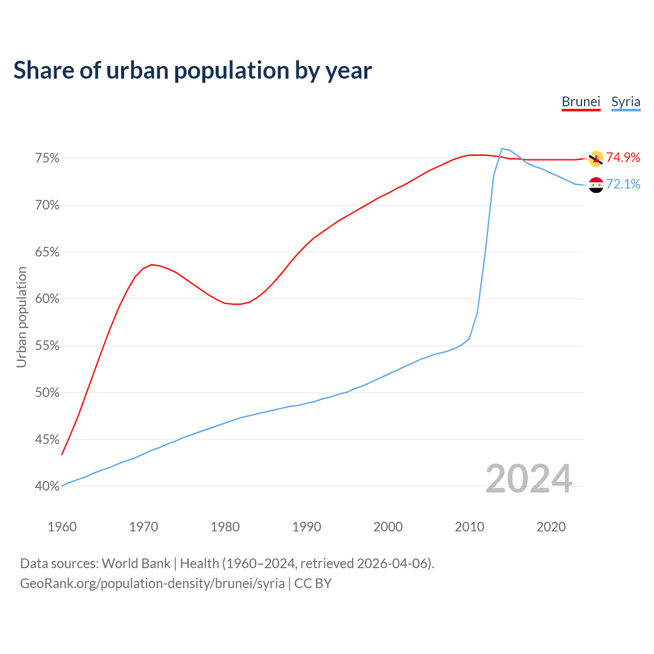 From 2004 to 2024, the share of urban population changed from 73.1% to 74.9% in Brunei and from 53.5% to 72.1% in Syria.