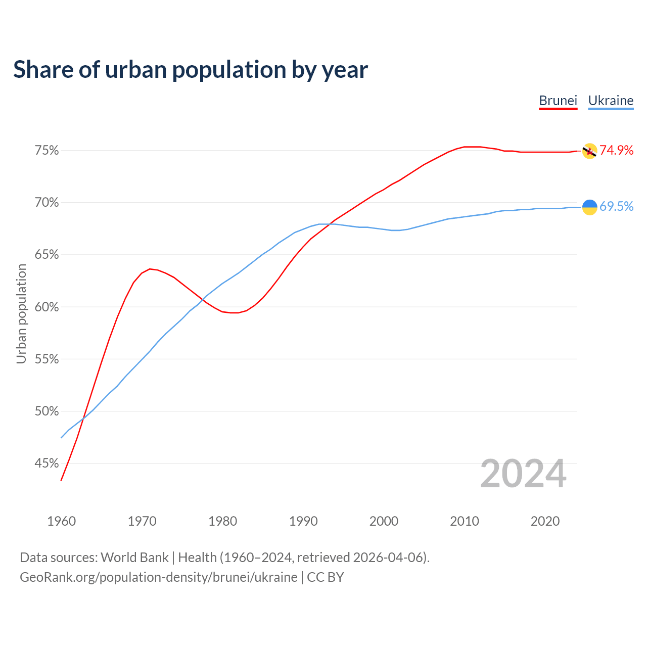 From 2004 to 2024, the share of urban population changed from 73.1% to 74.9% in Brunei and from 67.6% to 69.5% in Ukraine.
