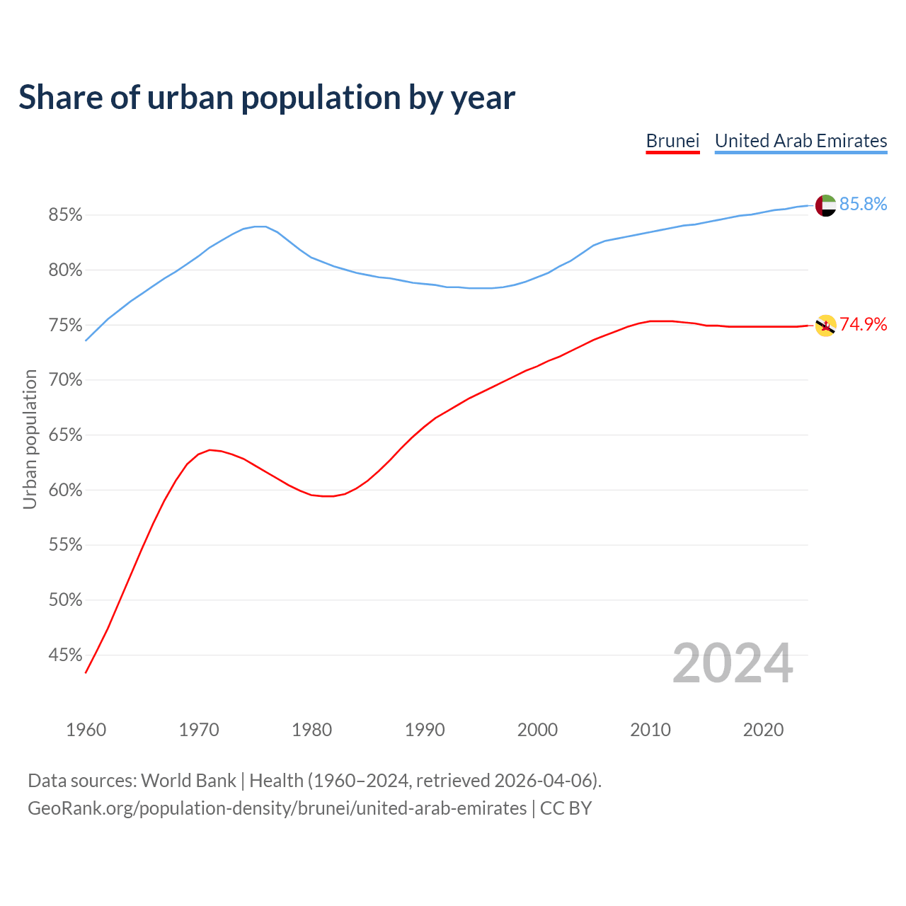 From 2004 to 2024, the share of urban population changed from 73.1% to 74.9% in Brunei and from 81.5% to 85.8% in the United Arab Emirates.
