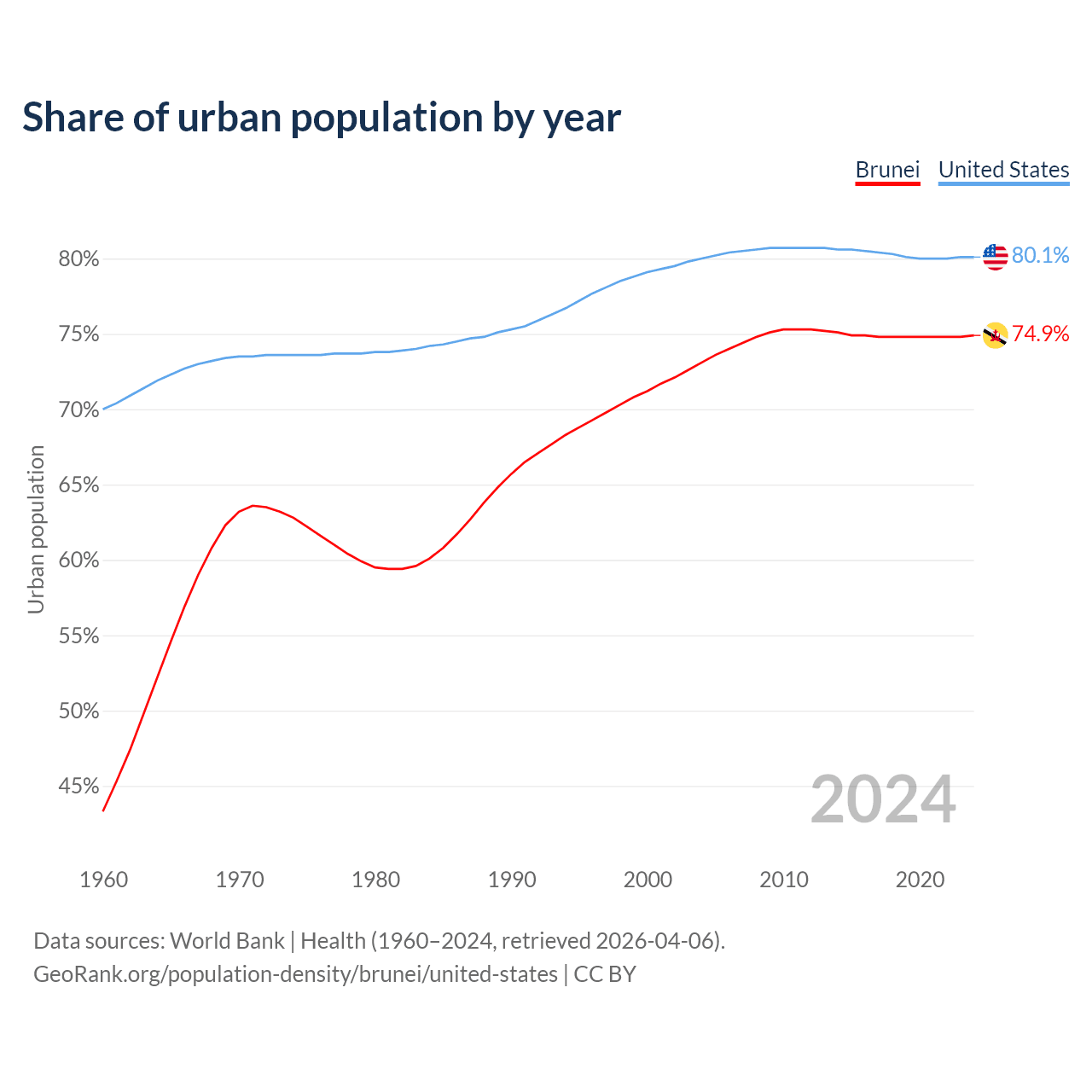 From 2004 to 2024, the share of urban population changed from 73.1% to 74.9% in Brunei and from 80% to 80.1% in the United States.