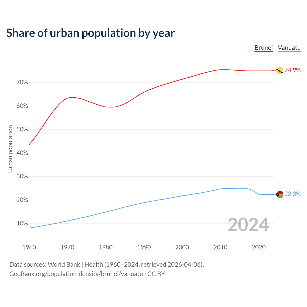 From 2004 to 2024, the share of urban population changed from 73.1% to 74.9% in Brunei and from 22.7% to 22.3% in Vanuatu.
