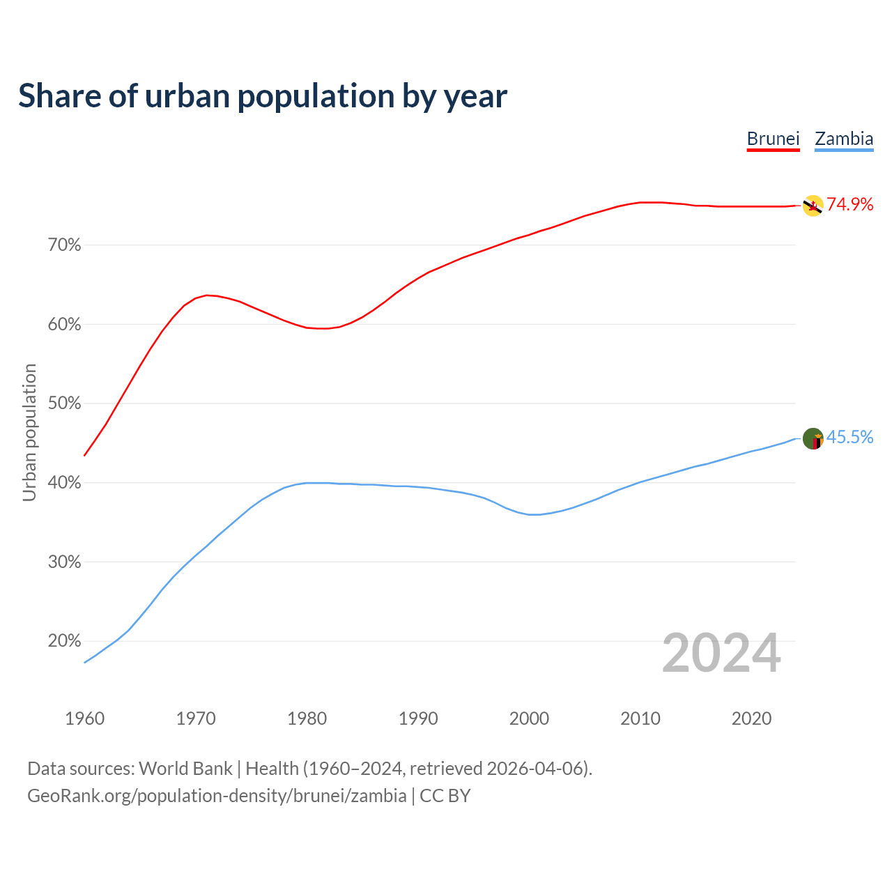 From 2004 to 2024, the share of urban population changed from 73.1% to 74.9% in Brunei and from 36.8% to 45.5% in Zambia.