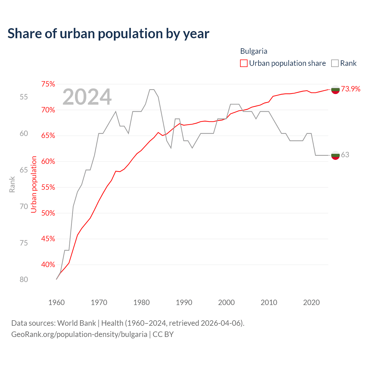 This chart shows the share of urban population in Bulgaria from 1960 to 2024: 37.1% lived in urban areas in 1960, 68.3% in 2000, and 73.9% in 2024.