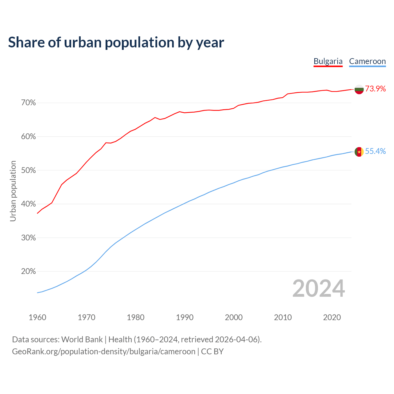 From 2004 to 2024, the share of urban population changed from 69.9% to 73.9% in Bulgaria and from 48.2% to 55.4% in Cameroon.