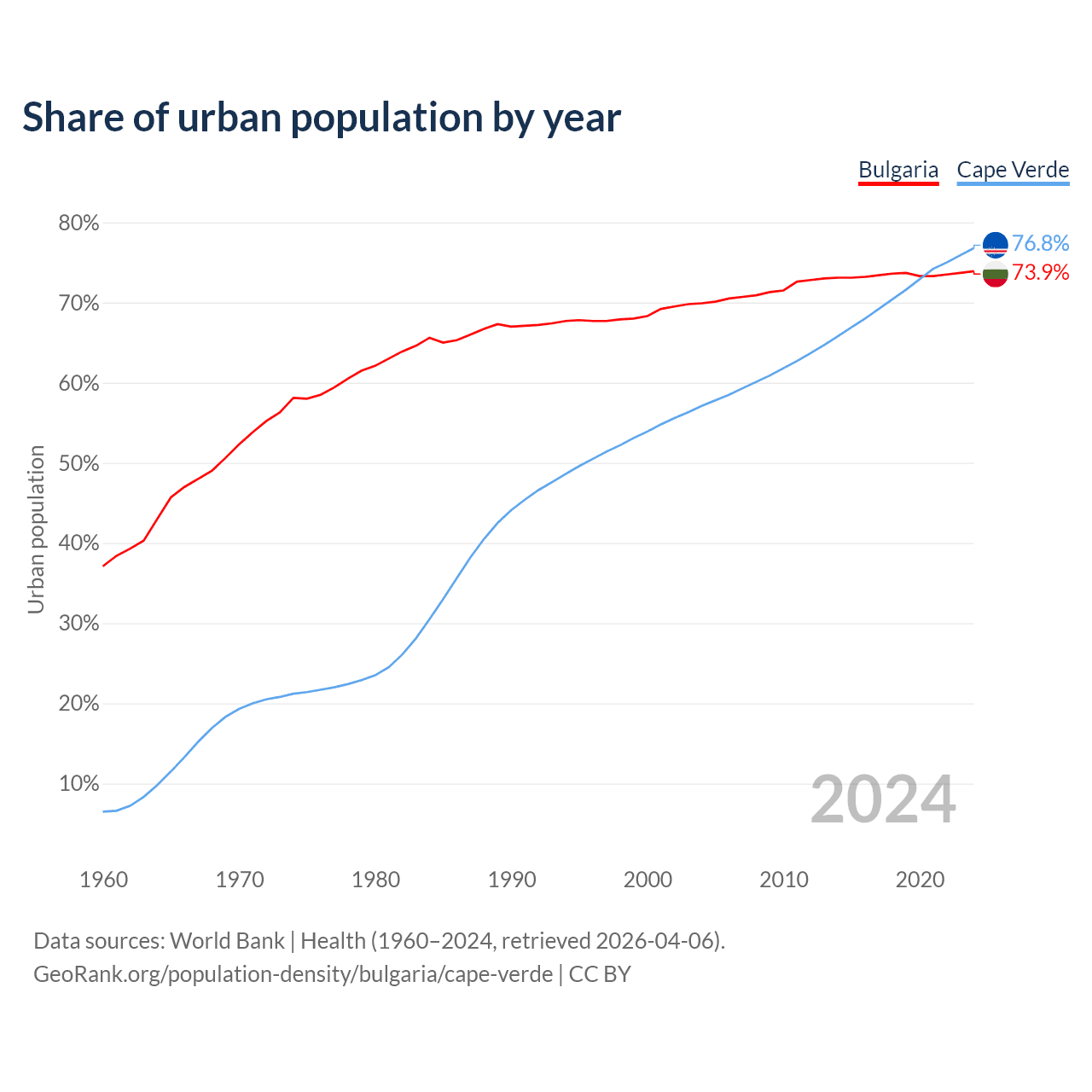 From 2004 to 2024, the share of urban population changed from 69.9% to 73.9% in Bulgaria and from 57.1% to 76.8% in Cape Verde.