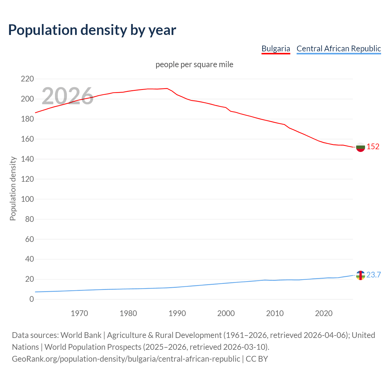 From 2006 to 2026, population density in Bulgaria decreased by 16.3%, compared to a 30.3% growth in the Central African Republic.