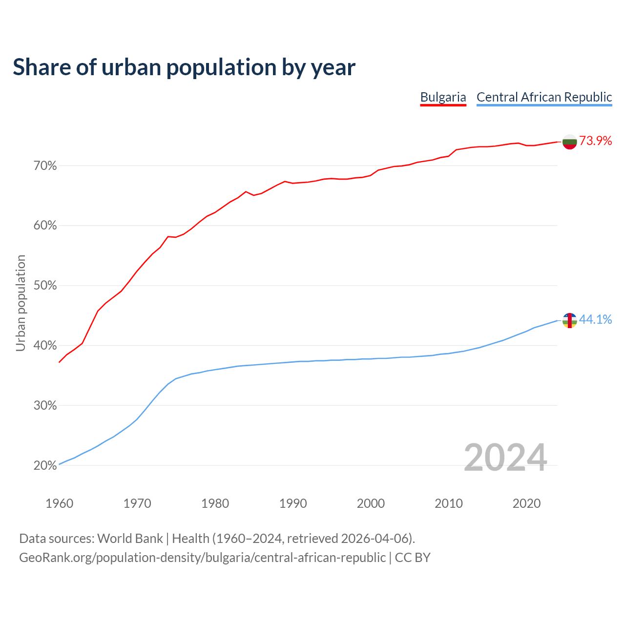 From 2004 to 2024, the share of urban population changed from 69.9% to 73.9% in Bulgaria and from 38% to 44.1% in the Central African Republic.
