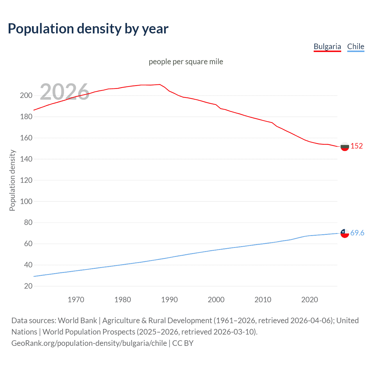 From 2006 to 2026, population density in Bulgaria decreased by 16.3%, compared to a 21% growth in Chile.