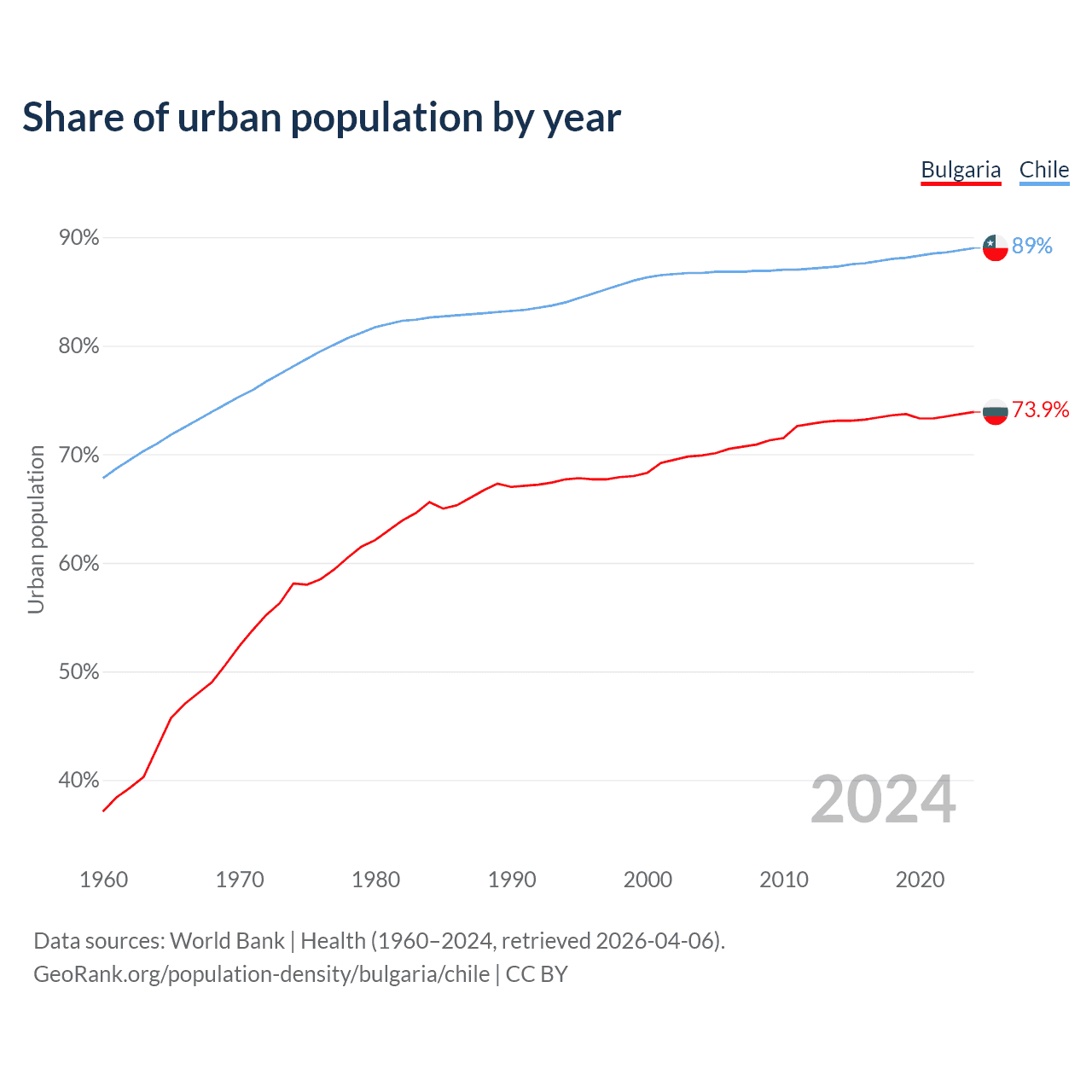 From 2004 to 2024, the share of urban population changed from 69.9% to 73.9% in Bulgaria and from 86.7% to 89% in Chile.