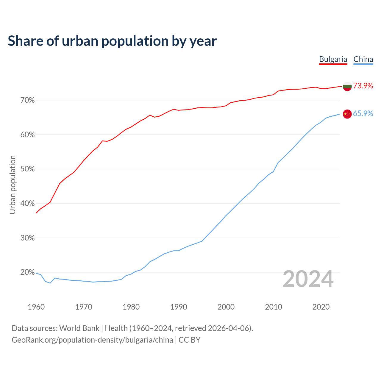 From 2004 to 2024, the share of urban population changed from 69.9% to 73.9% in Bulgaria and from 41.8% to 65.9% in China.