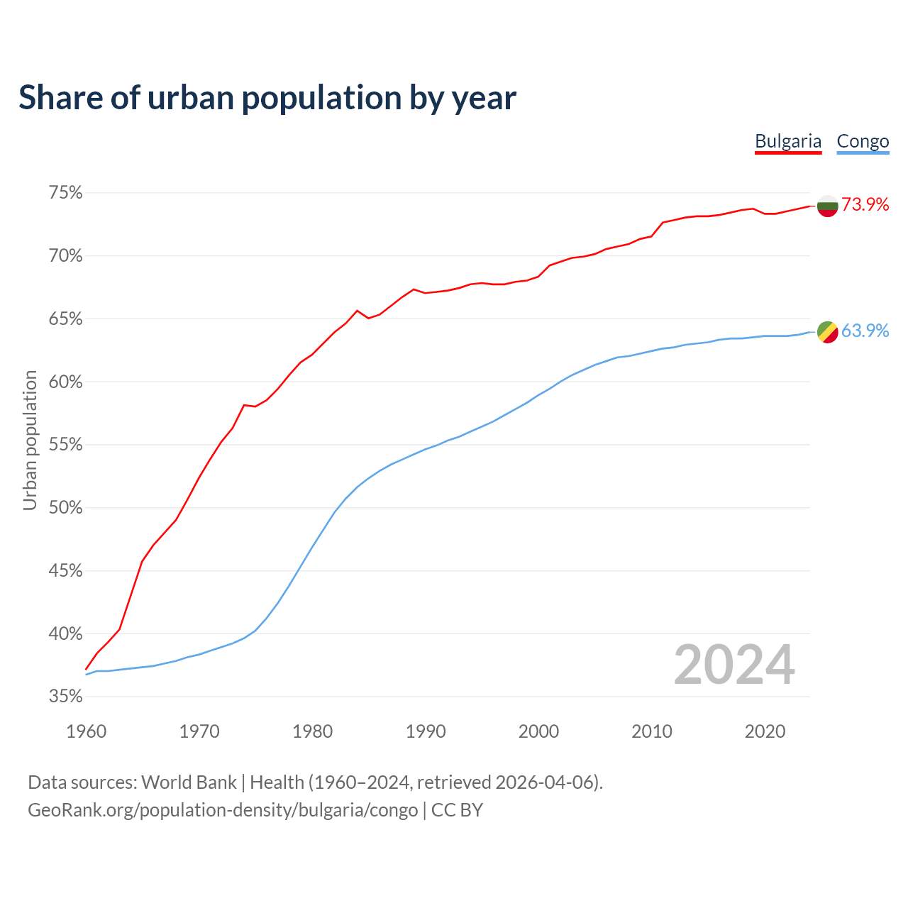 From 2004 to 2024, the share of urban population changed from 69.9% to 73.9% in Bulgaria and from 60.9% to 63.9% in the Congo.
