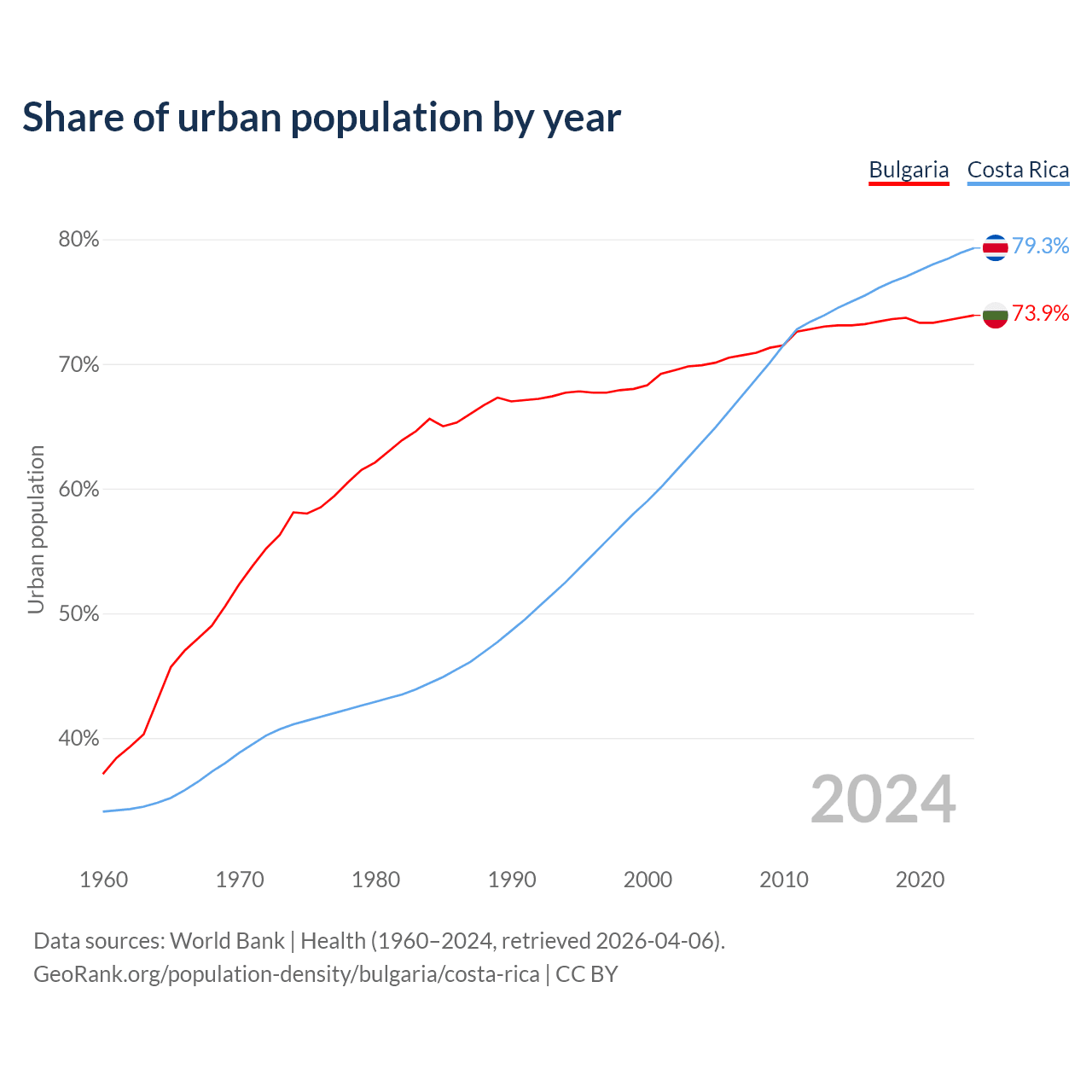 From 2004 to 2024, the share of urban population changed from 69.9% to 73.9% in Bulgaria and from 63.7% to 79.3% in Costa Rica.