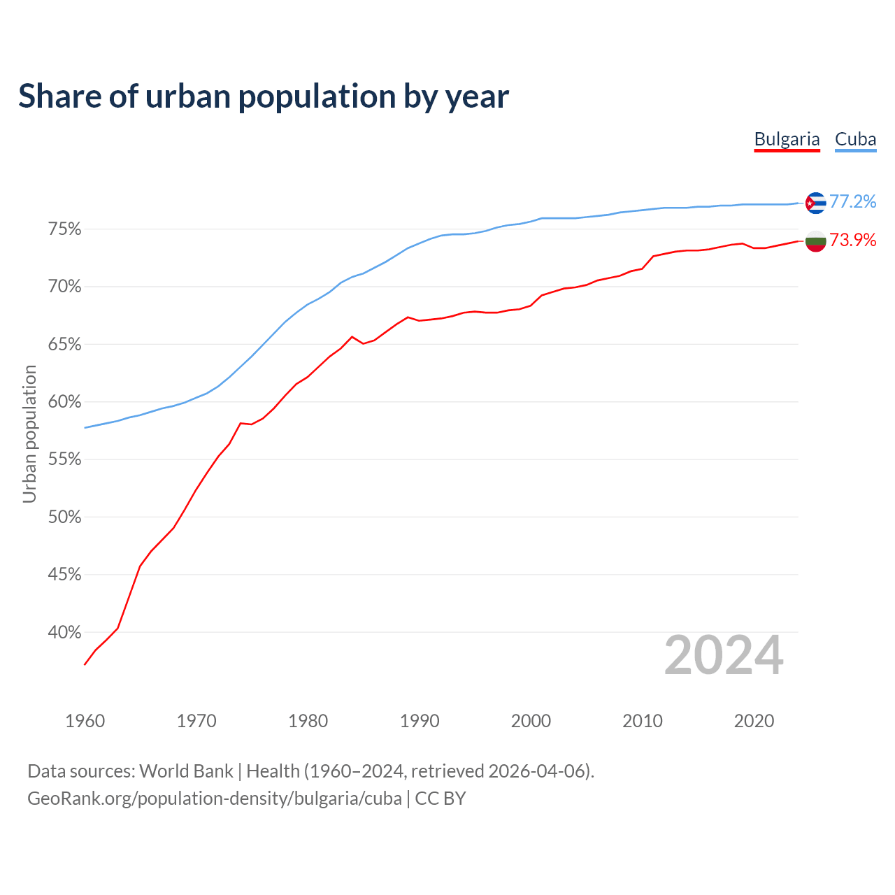 From 2004 to 2024, the share of urban population changed from 69.9% to 73.9% in Bulgaria and from 75.9% to 77.2% in Cuba.
