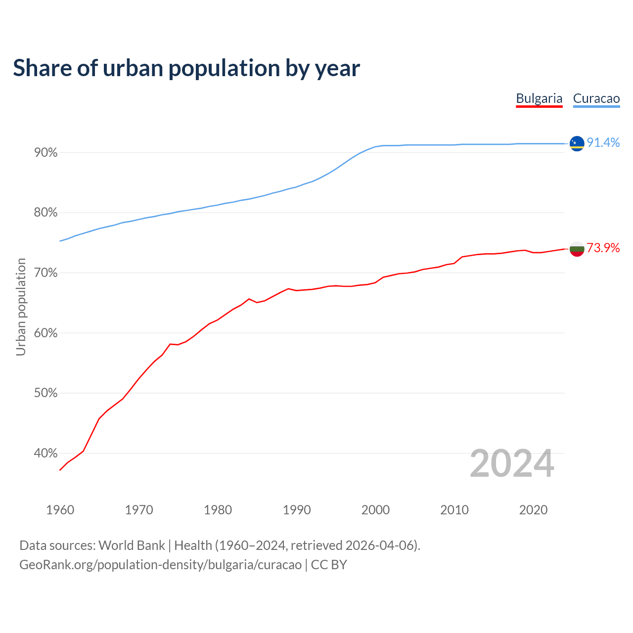 From 2004 to 2024, the share of urban population changed from 69.9% to 73.9% in Bulgaria and from 91.2% to 91.4% in Curacao.