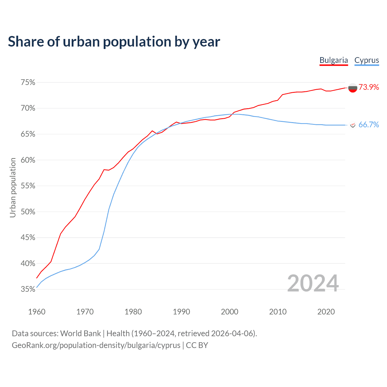 From 2004 to 2024, the share of urban population changed from 69.9% to 73.9% in Bulgaria and from 68.6% to 66.7% in Cyprus.