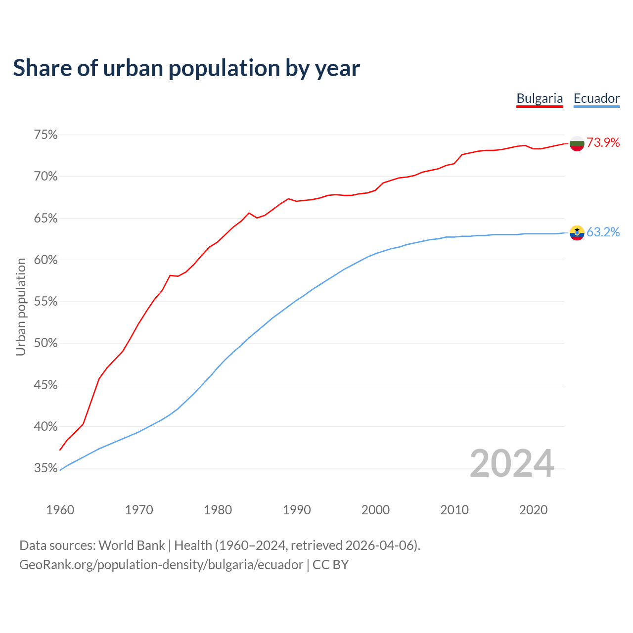From 2004 to 2024, the share of urban population changed from 69.9% to 73.9% in Bulgaria and from 61.8% to 63.2% in Ecuador.
