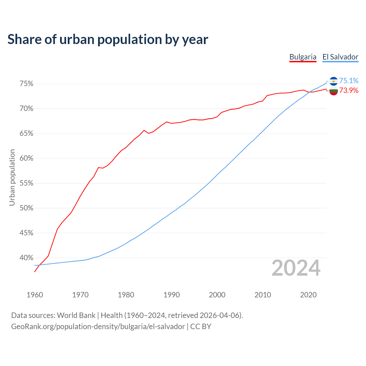 From 2004 to 2024, the share of urban population changed from 69.9% to 73.9% in Bulgaria and from 60.1% to 75.1% in El Salvador.