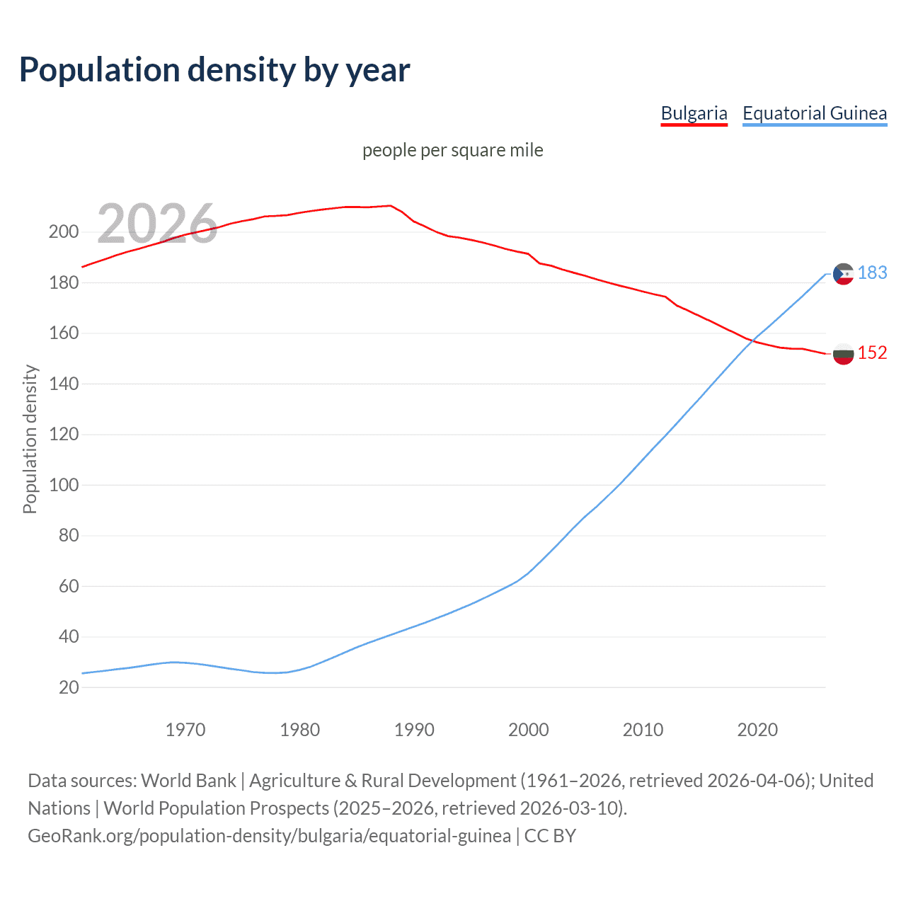From 2006 to 2026, population density in Bulgaria decreased by 16.3%, compared to a 100.5% growth in Equatorial Guinea.