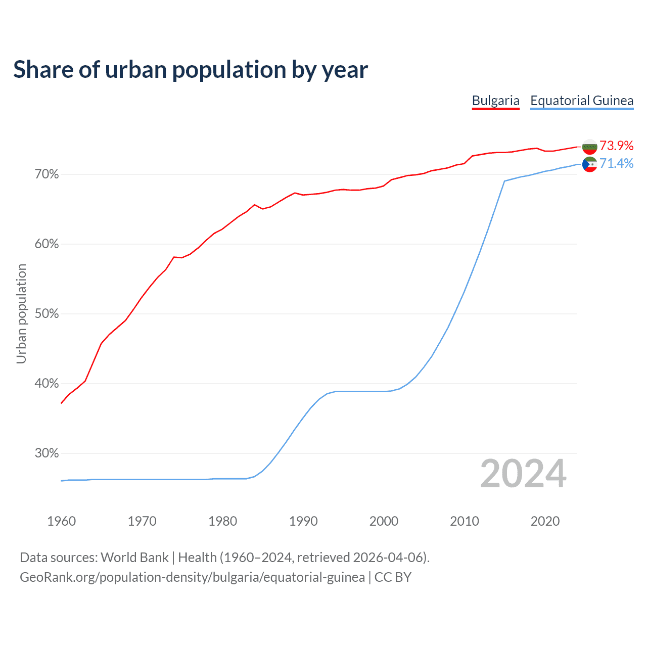 From 2004 to 2024, the share of urban population changed from 69.9% to 73.9% in Bulgaria and from 40.9% to 71.4% in Equatorial Guinea.