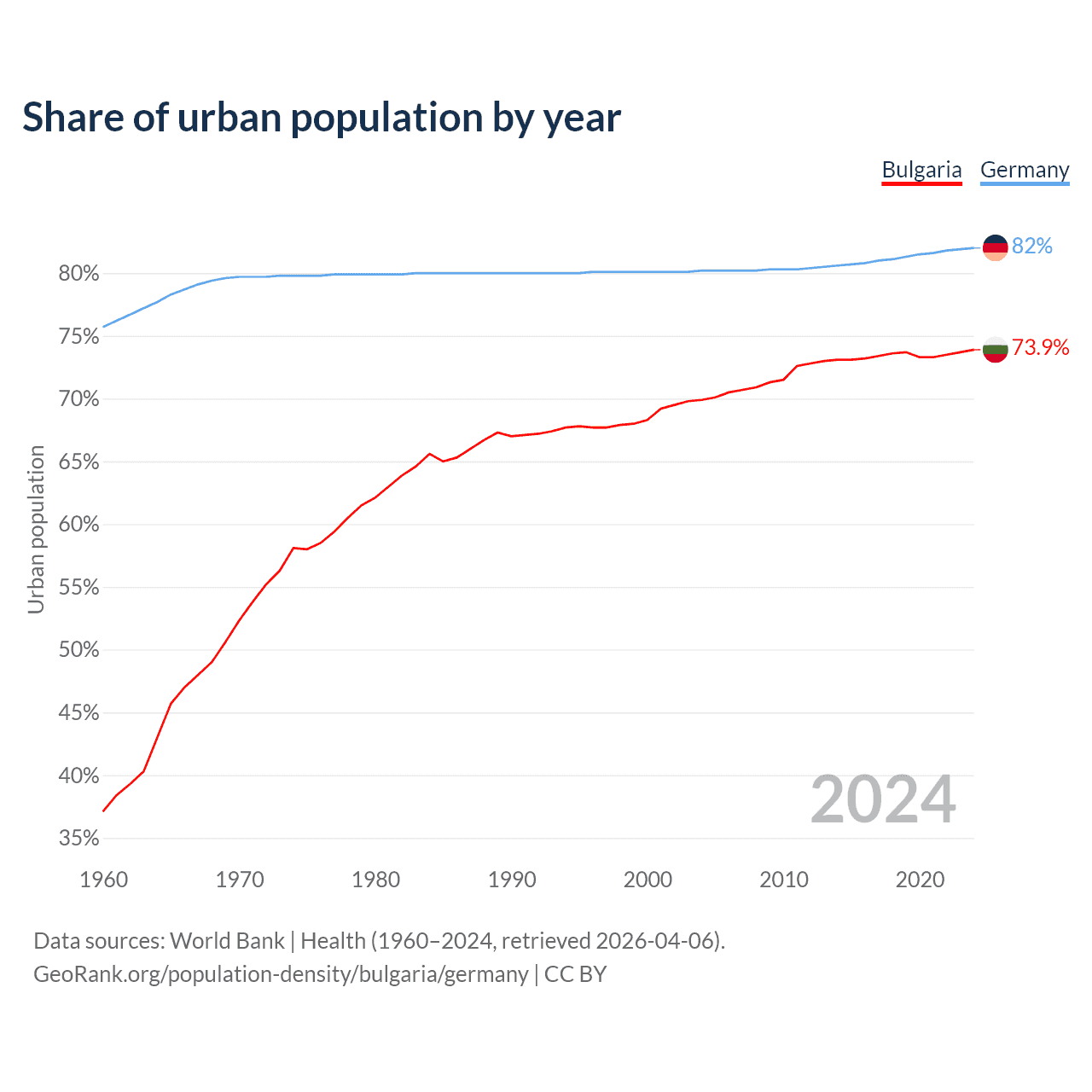 From 2004 to 2024, the share of urban population changed from 69.9% to 73.9% in Bulgaria and from 80.2% to 82% in Germany.