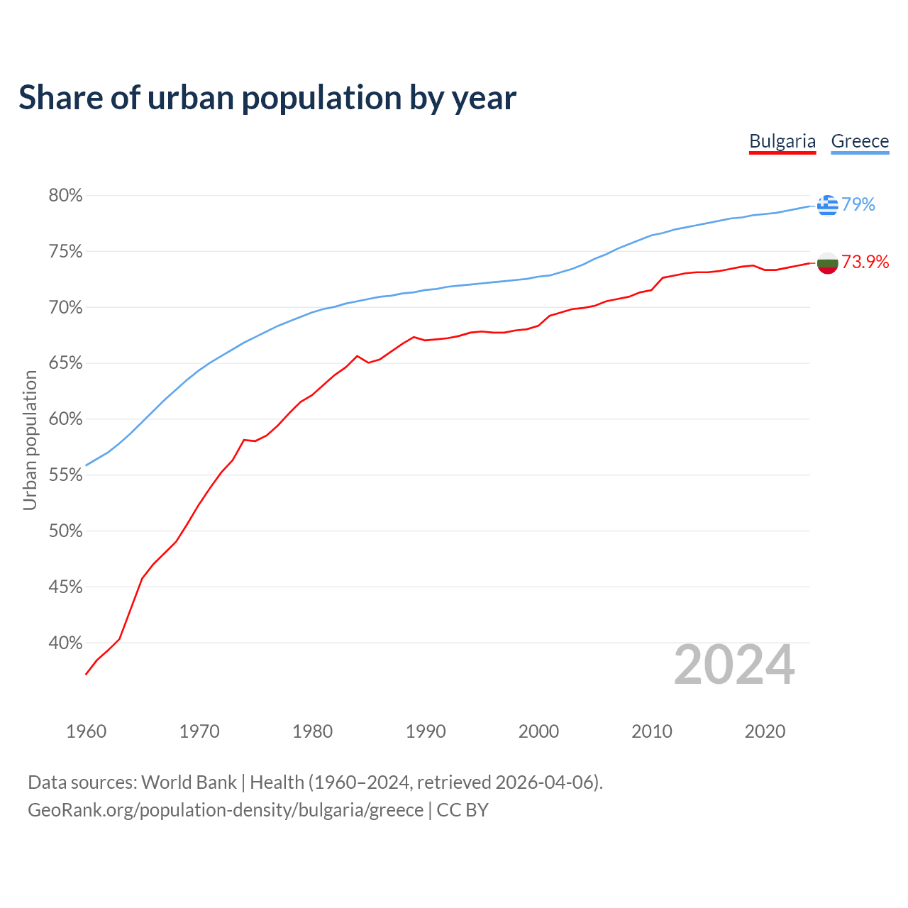 From 2004 to 2024, the share of urban population changed from 69.9% to 73.9% in Bulgaria and from 73.8% to 79% in Greece.