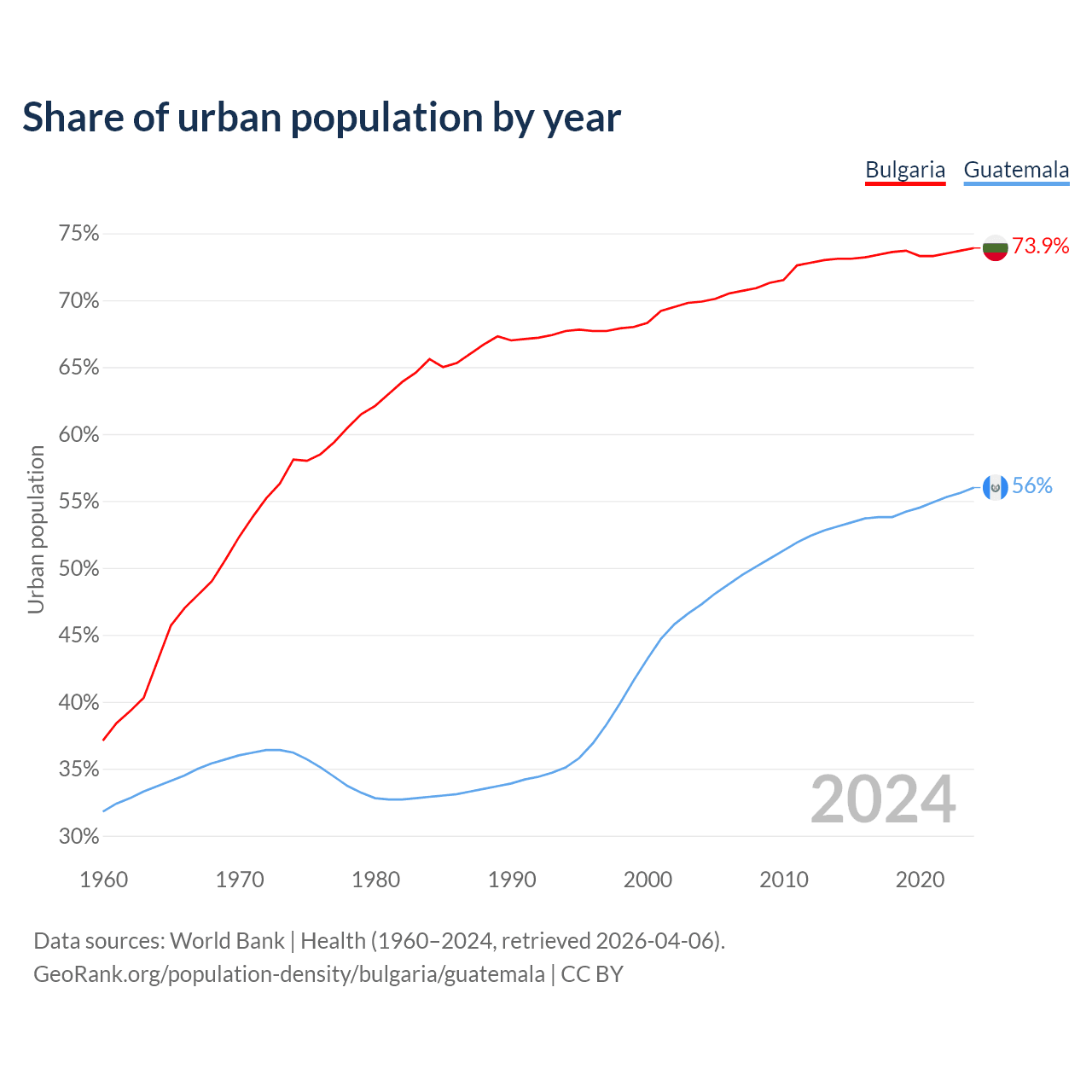 From 2004 to 2024, the share of urban population changed from 69.9% to 73.9% in Bulgaria and from 47.3% to 56% in Guatemala.