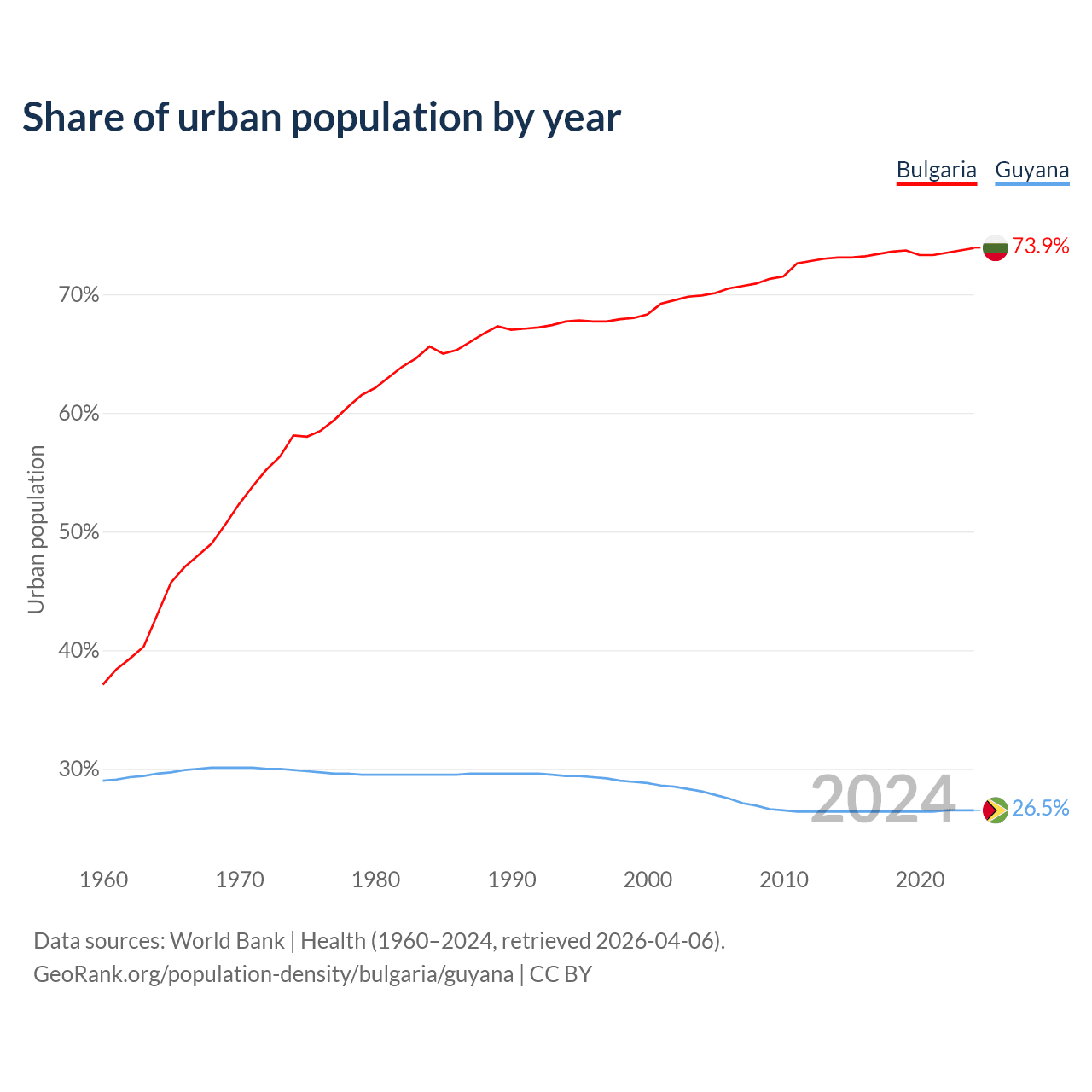 From 2004 to 2024, the share of urban population changed from 69.9% to 73.9% in Bulgaria and from 28.1% to 26.5% in Guyana.