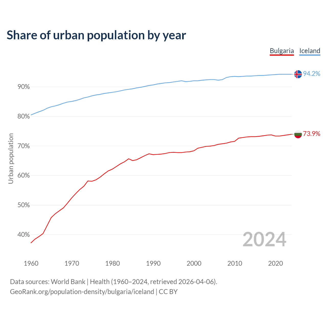 From 2004 to 2024, the share of urban population changed from 69.9% to 73.9% in Bulgaria and from 92.4% to 94.2% in Iceland.