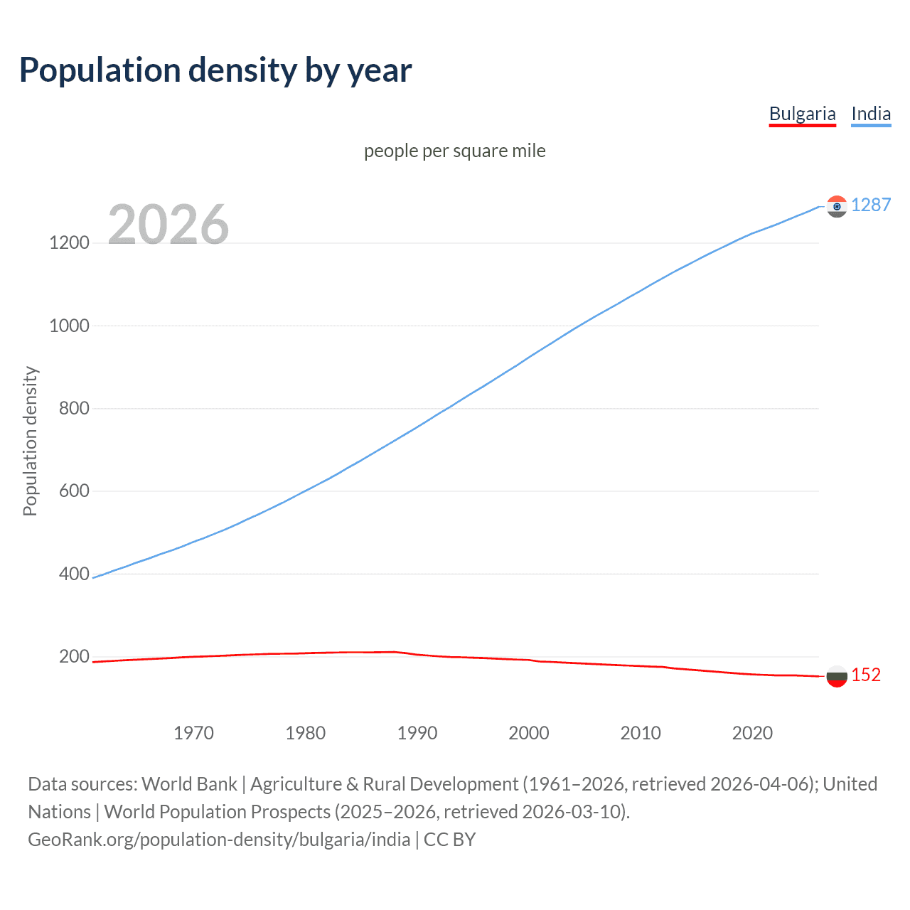 From 2006 to 2026, population density in Bulgaria decreased by 16.3%, compared to a 25.9% growth in India.
