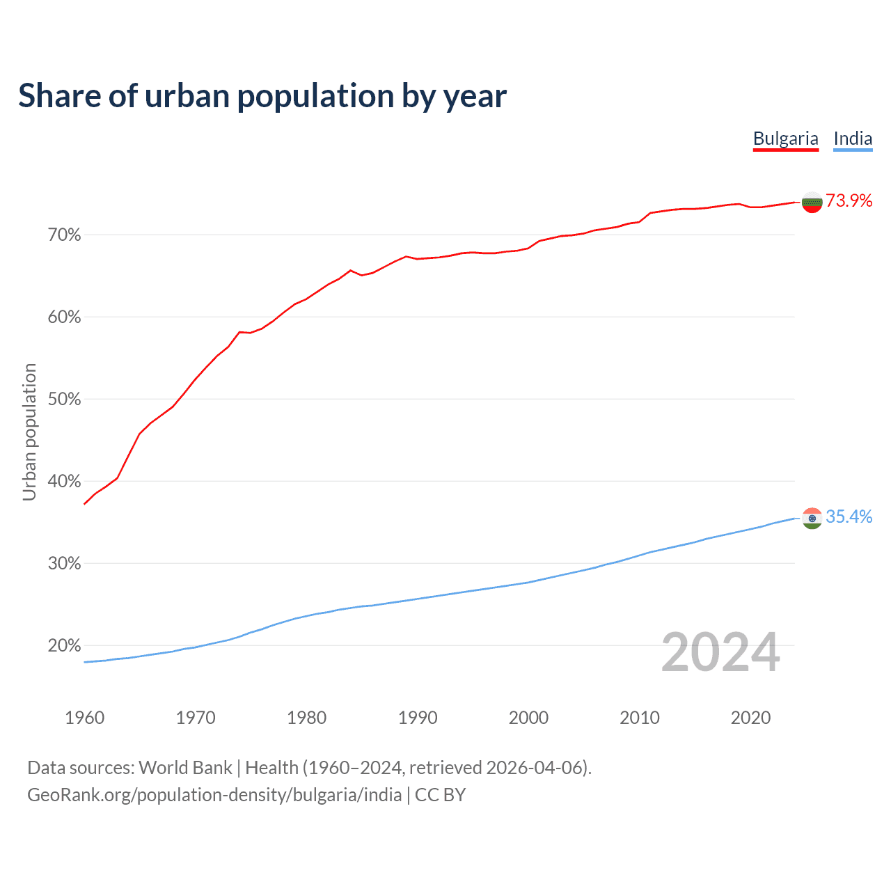 From 2004 to 2024, the share of urban population changed from 69.9% to 73.9% in Bulgaria and from 28.8% to 35.4% in India.