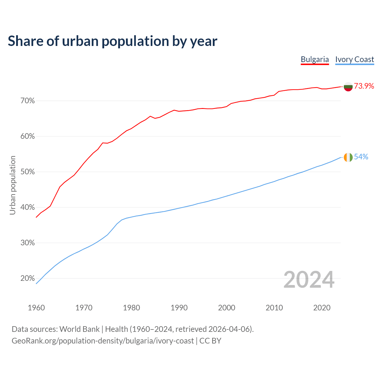 From 2004 to 2024, the share of urban population changed from 69.9% to 73.9% in Bulgaria and from 44.7% to 54% in Ivory Coast.