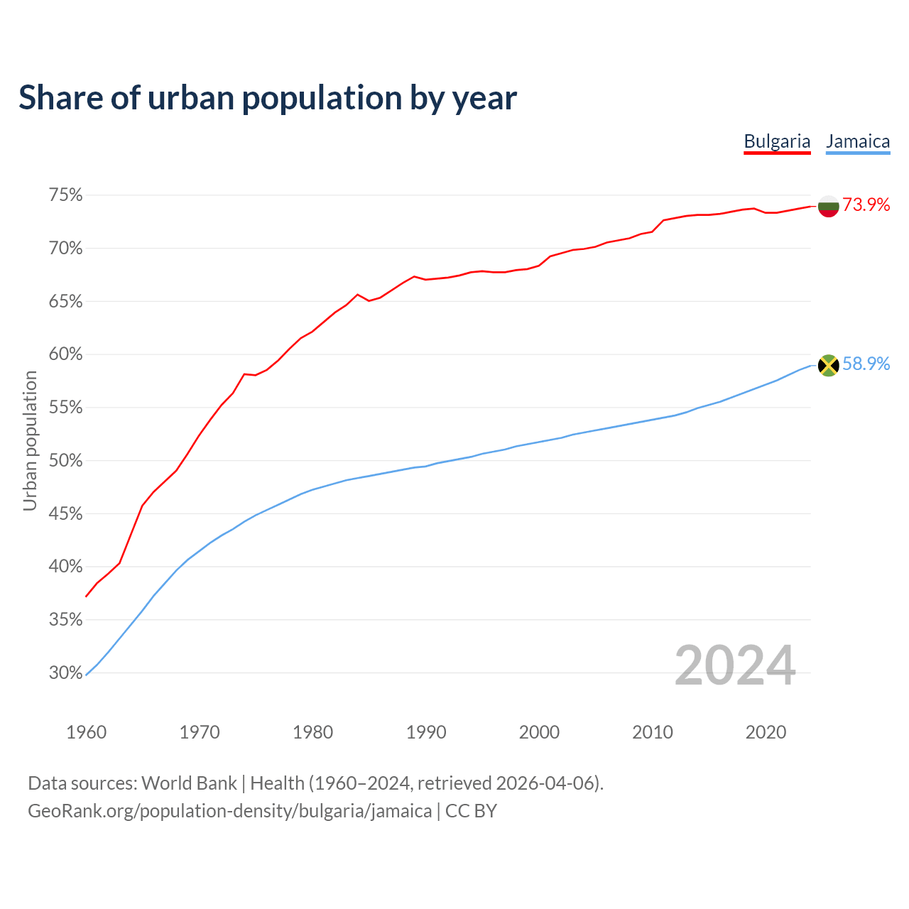 From 2004 to 2024, the share of urban population changed from 69.9% to 73.9% in Bulgaria and from 52.6% to 58.9% in Jamaica.