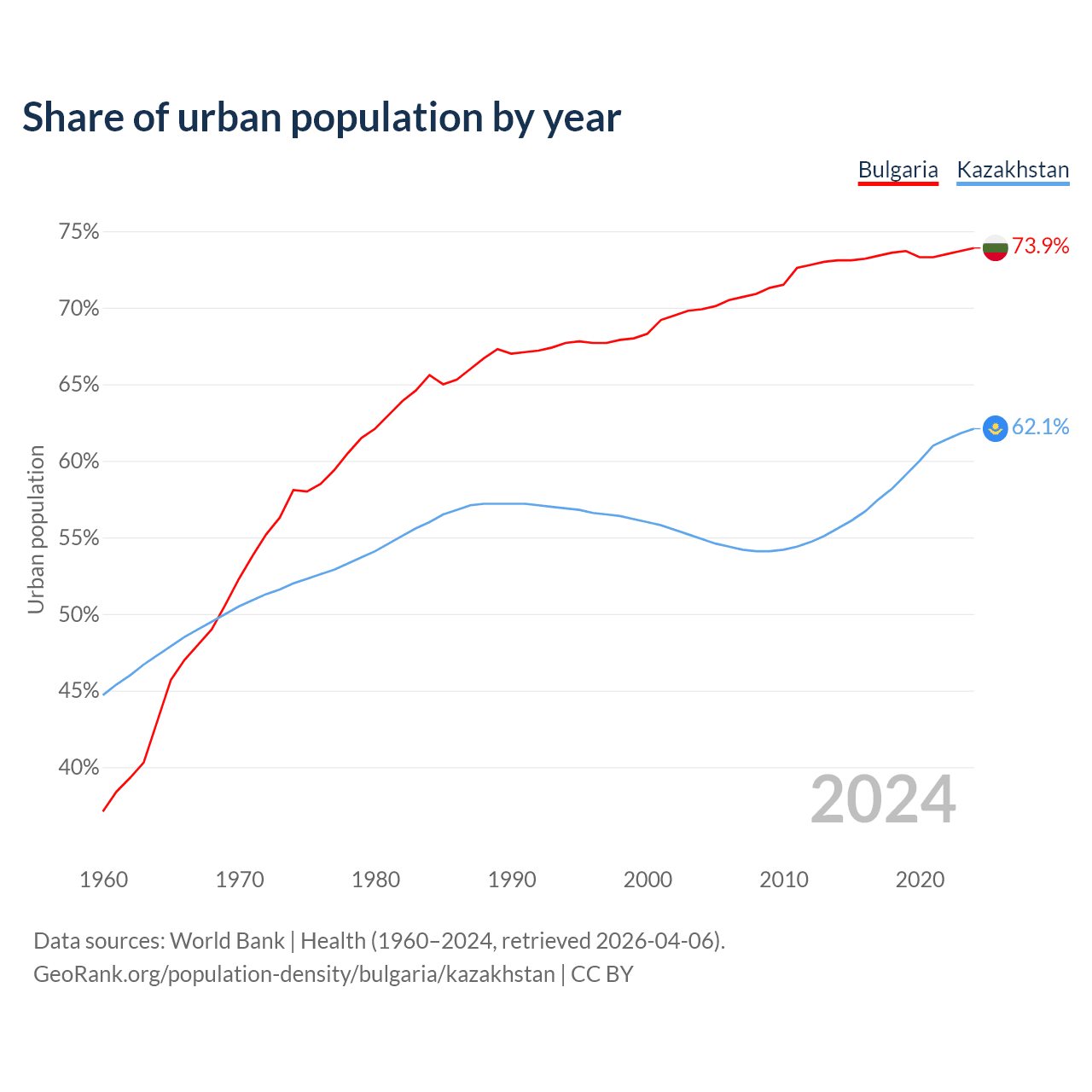 From 2004 to 2024, the share of urban population changed from 69.9% to 73.9% in Bulgaria and from 54.9% to 62.1% in Kazakhstan.