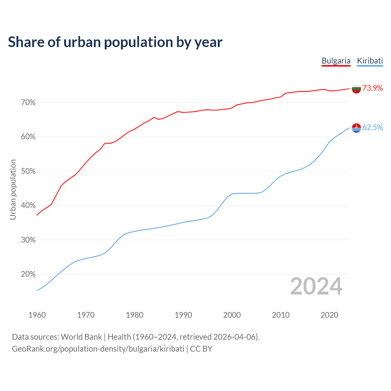 From 2004 to 2024, the share of urban population changed from 69.9% to 73.9% in Bulgaria and from 43.5% to 62.5% in Kiribati.