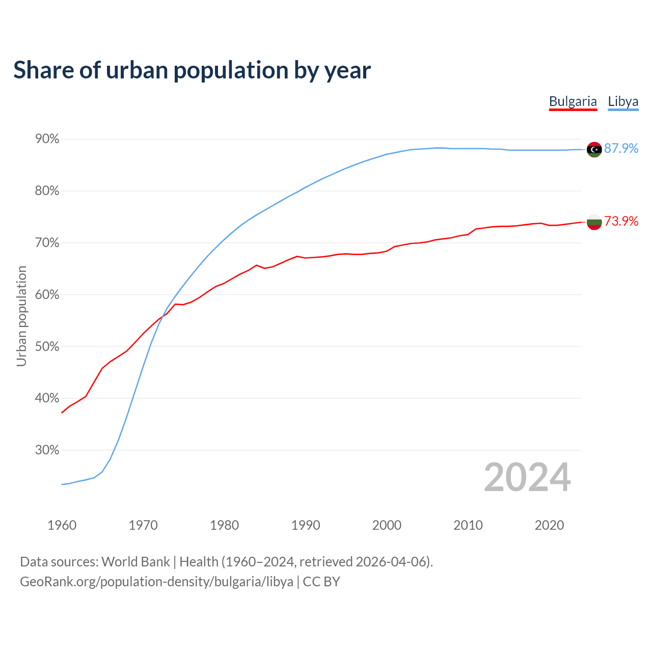 From 2004 to 2024, the share of urban population changed from 69.9% to 73.9% in Bulgaria and from 88% to 87.9% in Libya.