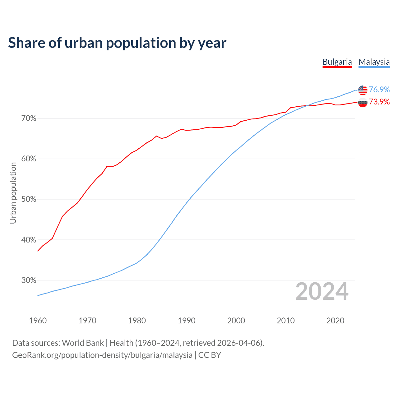 From 2004 to 2024, the share of urban population changed from 69.9% to 73.9% in Bulgaria and from 66.1% to 76.9% in Malaysia.