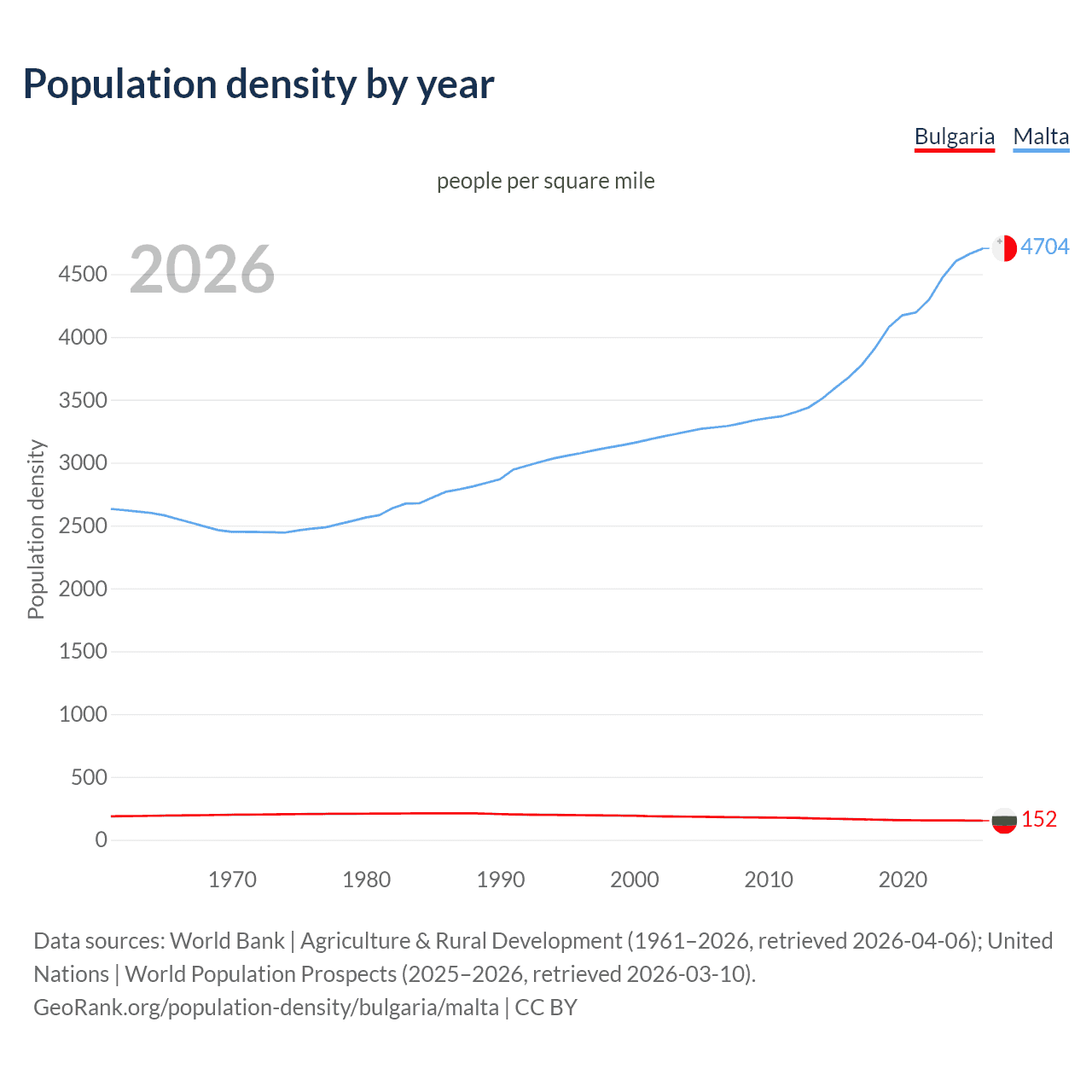 From 2006 to 2026, population density in Bulgaria decreased by 16.3%, compared to a 43.4% growth in Malta.