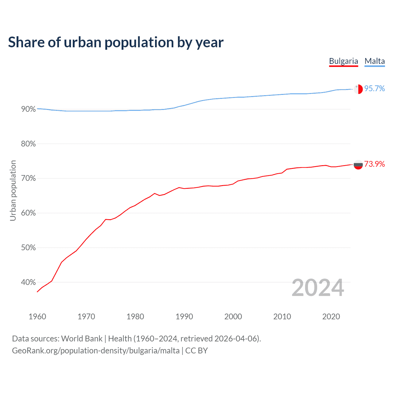 From 2004 to 2024, the share of urban population changed from 69.9% to 73.9% in Bulgaria and from 93.6% to 95.7% in Malta.